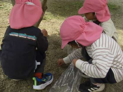 三連休が明け、園庭すべり台近くのキンモクセイが、今年も香りいっぱいに咲いていました。子どもたちはすぐに気がついて、早速落ちている花を集めて、砂のケーキを作ったり、袋に入れて友達と見せ合ったりしながら楽しそうに過ごしていました。