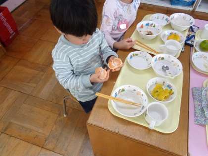 子どもたちは自分でみかんの皮をむいて、美味しそうに食べていました。旬の食べ物をたくさん食べて、元気に過ごしましょうね。