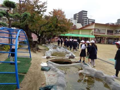 質問タイムの後は園庭を見て回りました。卒園生は、「変わってないなぁ」「この山で水流して遊んでたわ」と懐かしみ、初めて来た生徒は「金魚おるやん!」「亀もおるんや」といろいろ発見を楽しんでいました。