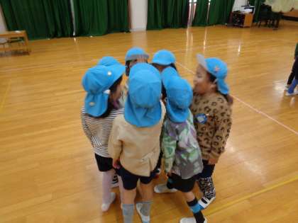 子どもたちでチーム分けをしていました。「あと人○人青チームにならないと一緒にならないねん」「じゃあ、ぼく行くわ」と話し合い決めていました。