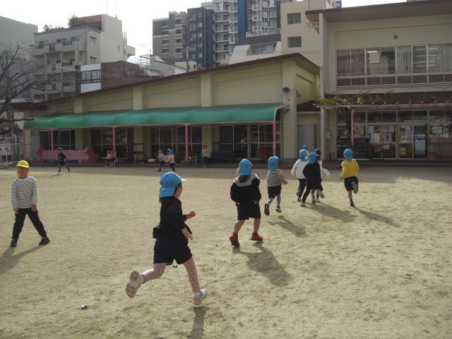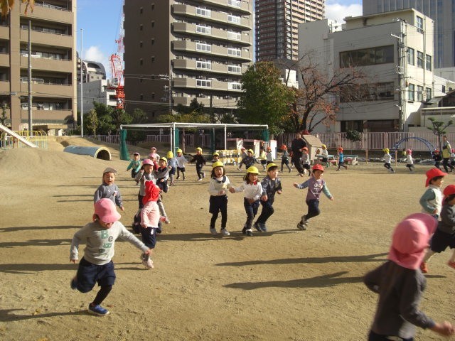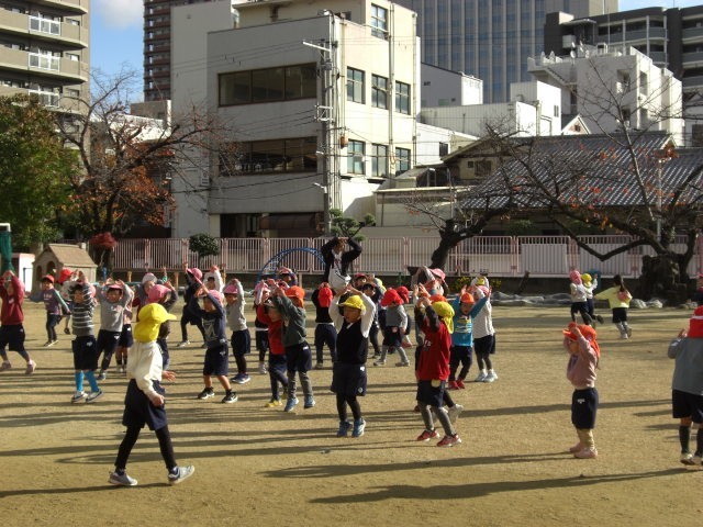 寒い朝が始まり、吐く息が白くなるほど冷たい空気の中、園庭では子どもたちが体操をして少し体を動かした後、軽やかな音楽に合わせて芝生の周りをマラソンしています。