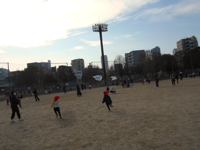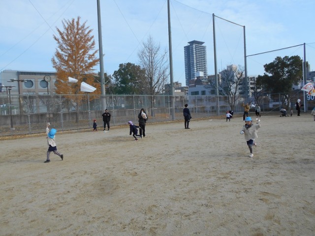 自分の凧に絵をかいて、外であげることを心待ちにしていた子どもたち。広いグラウンドいっぱいに走って、おうちの人と一緒に凧あげを楽しんでいました!