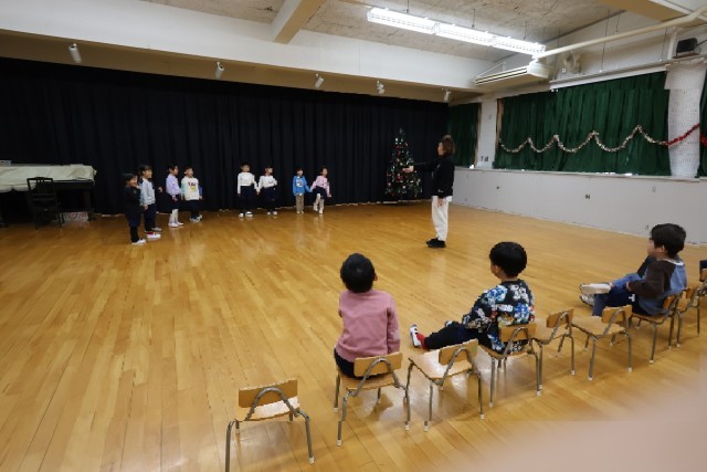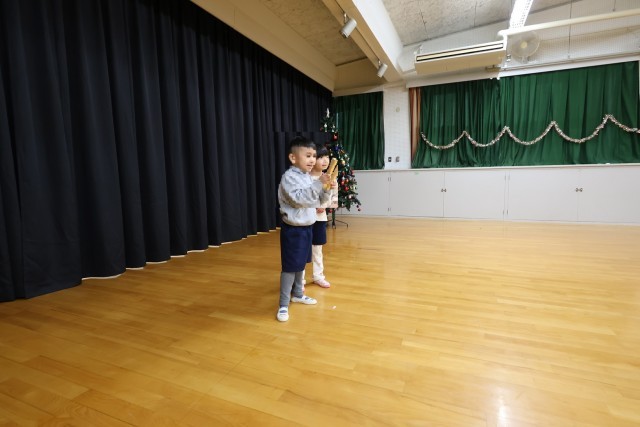ふじ組では、絵本『さんまいのおふだ』を元に、さんまいのおふだごっこを楽しんでいます。「今日は、便所のところやりたいな!」「やまんばから『逃げろ~』って言っているところしたい!」など、子どもたちが中心となって遊びが展開しています。お札を持って「おらの代わりに、返事をしてくれ~!」と小僧が言う場面でも、絵本通りの言葉ではなく、「こうやって言ったほうがいいかも!」と、自分たちの言葉に変えています。また、友達のやっている姿を見て、よりアイデアや意欲が湧く子どももいました。