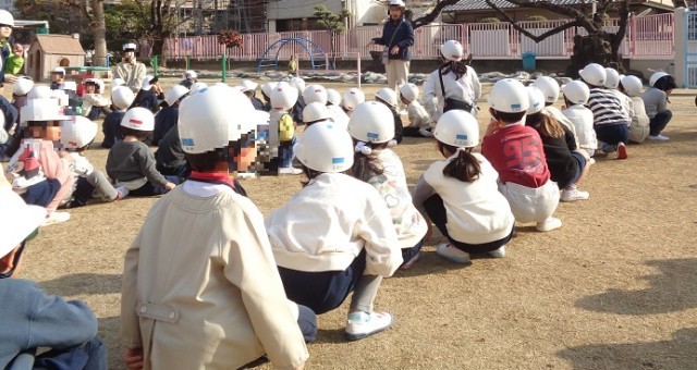 幼稚園に帰ってきてからも、いつ大きな地震が来ても落ち着いて避難ができるようにそれぞれのクラスで振り返りをしています。おうちでも、もし大きな地震や津波など災害が起きたら、というお話をする機会にしてみてくださいね。