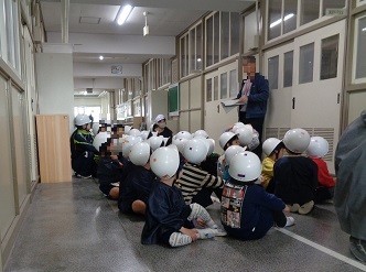 今日は、幼稚園と小学校合同で避難訓練を行いました。地震の避難訓練を幼稚園で行ったあと、津波が来るという想定で小学校の校舎の3階まで避難しました。子どもたちは、幼稚園でも小学校へ向かう道でも、先生のお話をよく聞いて落ち着いて避難をすることができていました。園長先生からは、31年前の阪神淡路大震災のときの様子について教えていただきました。小学校に避難をした後、教務主任の先生からは、落ち着いて避難できていたことや、「小学校の近くで何か困ったことがあったときは、いつでも小学校に来てくださいね」と、お話をしていただきました。