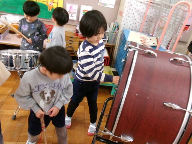 発表会予行の日に、年長さんが大太鼓、小太鼓、木琴、シンバルなどで合奏している姿を見て、「やってみたい」と期待をもった子どもたち。