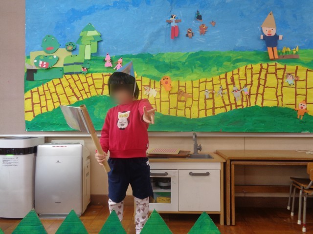 『オズの魔法使い』の劇の衣装を着て、「ブリキと出会う場面やろうよ!」と友達と決めて劇遊びを進めてみたり、楽器遊びの曲をCDで流して繰り返し合奏したりする姿がありますよ♪