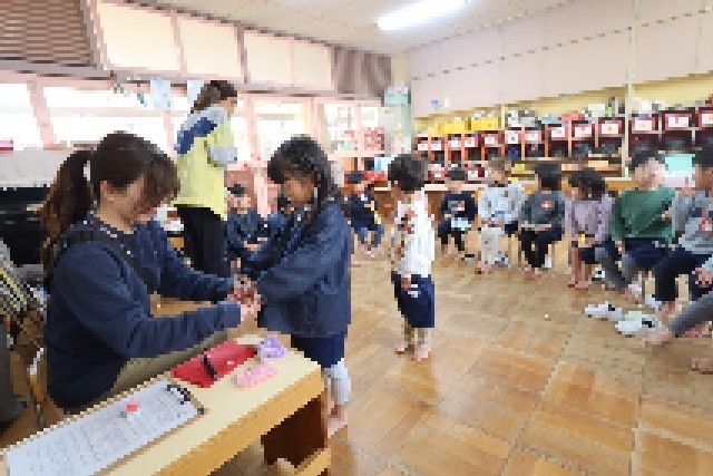 実施した結果、すべてに〇が付き花丸スタンプを押せた割合は、年少組が78.9%・年中組が74.2%・年長組が48.5%でした。学年が上がるごとにハンカチ・ティッシュを持ってきていない子どもが増えていました。年長組さんには「お家の人に用意してもらうんじゃなくて、これからは自分で毎朝ポケットにハンカチ・ティッシュが入ってるかチェックするんだよ。もし入ってなかったら、自分で入れるか、お家の人に言って用意してもらってね」と話しました。