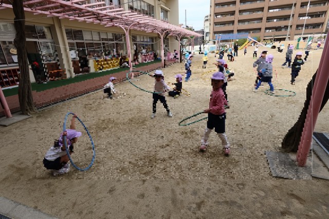 「ふじ組で過ごすのも、あともう少しだね」と子どもたちと振り返りながら、残り少ない幼稚園生活でどのような遊びをしたいのかを尋ねたところ、ドッチボールやリレー、たまちゃん探し(宝探し遊び)、「みんなでフープをしたい!」などが出てきました。