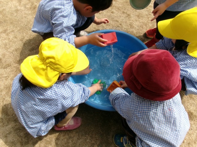 これまで砂場のスコップやバケツなどを洗うのは年長さんがしてくれていましたが、もうすぐ年長さんになるきく組の子どもたちは、「僕たちがするよ!」と張り切った様子で遊具をピカピカに洗っていました。