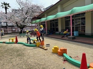 桜の木の下で花びらを集めたり、ダンゴムシを探したり、体を動かしたりして遊んでいます。新しいお友達も広い園庭でのびのびと遊んでいます。3月まで年中さんだったお友達もすっかり年長さんの顔になって、小さいお友達に優しくしている姿がありますよ。