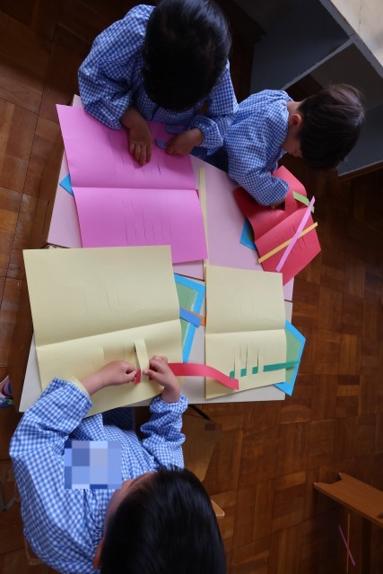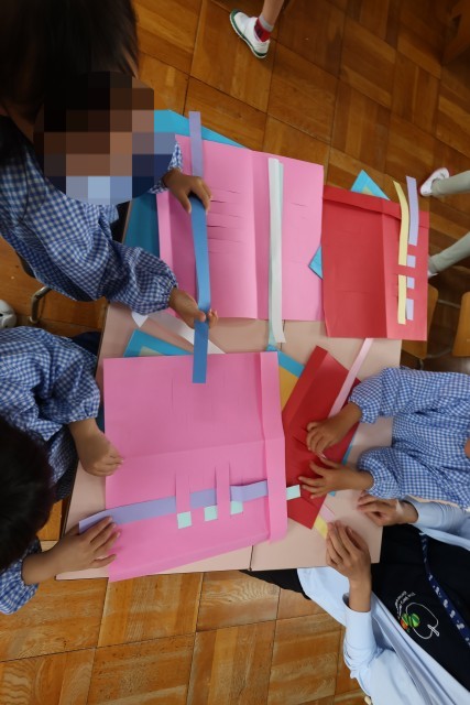 今回は画用紙を織って模様をつくる「織紙」という技法を行いました。紙を上下に順番に通していくのですが、紙を裏と表、どこから入れたらいいのかなど悩みながら一生懸命つくっていました。「もう、出来ない」と言いながらも友達や教師に教えてもらいながら最後まで頑張ってつくっている子どももいました。