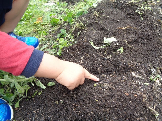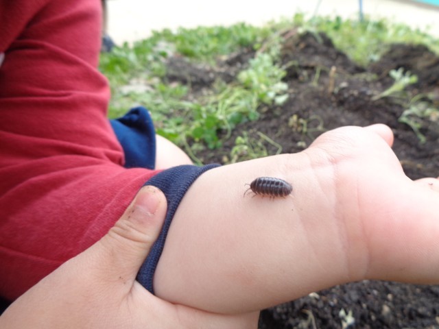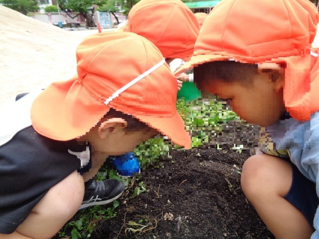 ある日のお外遊びでは、畑に集まって虫探しをしているばら組のお友達がいました。「先生!見て見て!」「あそこにアリさんがいるよ!」「ダンゴムシが丸まってる!」など、春になって元気いっぱいに動く虫たちに興味津々です。虫を触ってみたり、バケツに集めて観察したりしています。しかし、楽しくなりすぎて力強く触ってしまうお友達もいたので、「強く握ったらダンゴムシさん苦しいよ」と教師が伝えると、ハッとなり「ほんとだね!」と気付く様子がありました。虫探しをきっかけに生命の大切さについても伝えています。