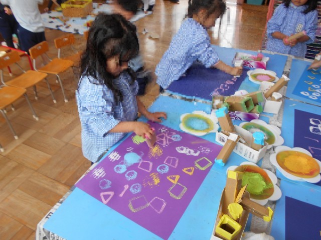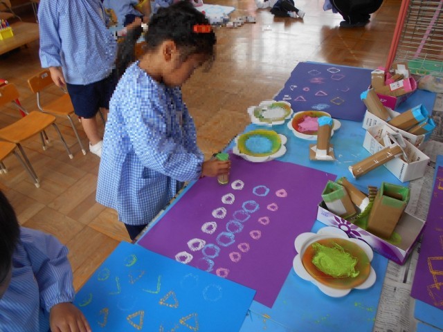 小さいこいのぼりは折り紙をはさみで切ってうろこをつくり、大きいこいのぼりは〇や△などのスタンプで模様をつけました。「うろこってどんな形かな」と切り方を考えたり、「スタンプしたらこんな形になったよ」発見したり、ワクワクした様子でこいのぼりづくりを楽しみました。