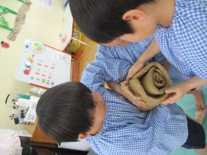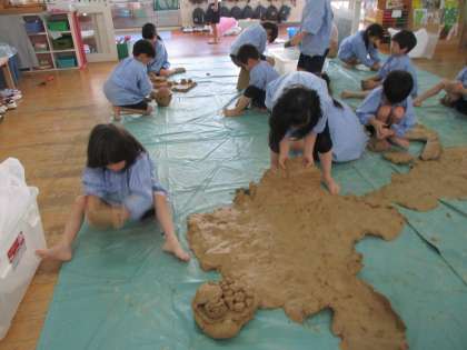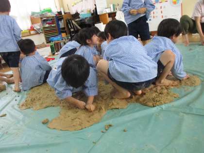 きく組さんが土ねんどで遊びました。足で踏んづけたり、手でちぎったり丸めたり、全身で土ねんどに触れていました。「冷たいよ」「つながった!」「見て見て」と、自分の感じたこと考えたことを友達や先生と共有することで、楽しさが広がっていました。