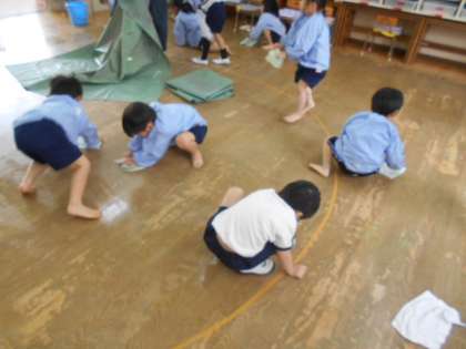 ばら組がローラーを使って絵の具遊びをしました。最近子どもたちが興味や関心をもっているダンゴムシがお散歩をする道を大きな紙に表現しました。長い道やくねくね道、いろいろな散歩道ができました。最後はみんなで床をきれいに拭きました!