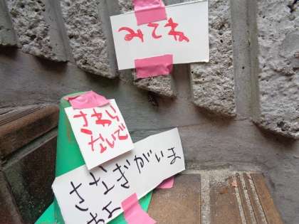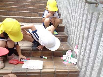 幼稚園の正門から「先生!サナギがいる」「ピカピカ光ってるよ」と大発見を知らせる声が聞こえてきました。みんなに知らせたい!そして大切にしたい!という思いから、こんな看板を作ってくれました。