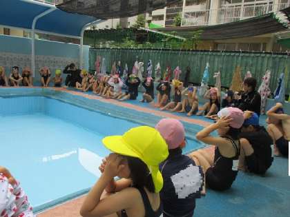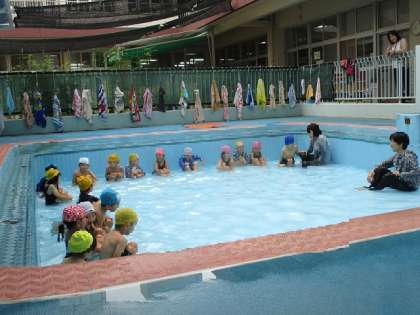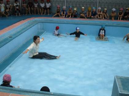 プール開きでは、きく組(5歳児)がはじめに遊ぶ様子を見せてくれたので、ばら組(4歳児)とさくら組(3歳児)も安心してプール遊びを楽しめました。