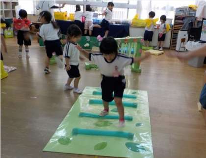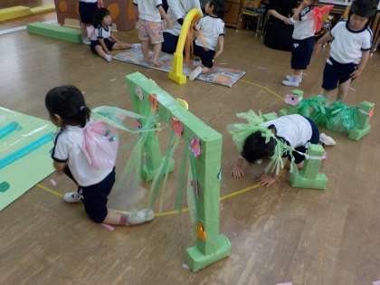 子どもたちの興味や関心を捉えて、草の道やトンネルなど「楽しそうだな!」「やってみたい!」と思わず遊びたくなうような環境を、先生は工夫しながらつくっています。