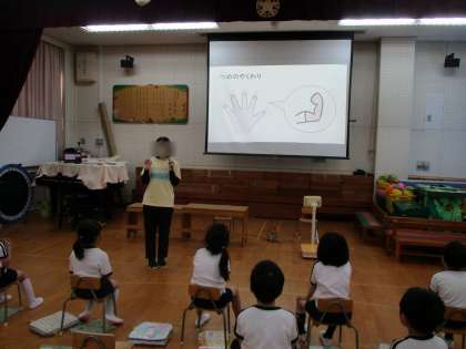 6月は「爪」についての保健指導を行いました。爪の役割や爪を切るタイミングを知らせました。手のひらから見て爪が見えていたら切るタイミングです。子どもたちにわかりやすく伝えるために養護教諭が実際に爪を伸ばし子どもたちに見てもらいました。「(自分の爪と)ぜんぜん違う!」と見比べながら興味を持って見ている姿が見られました。