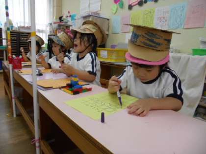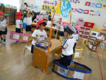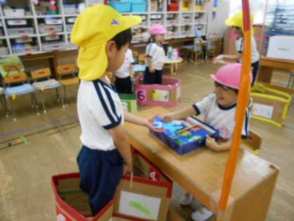今日は、3学年みんなで一緒に遊びました。さくら組(3歳児)も2階の電車ごっこの場で、ばら組(4歳児)きく組(5歳児)の遊びを真似て、駅長さんや切符売り場の駅員さんになって遊んでいました。