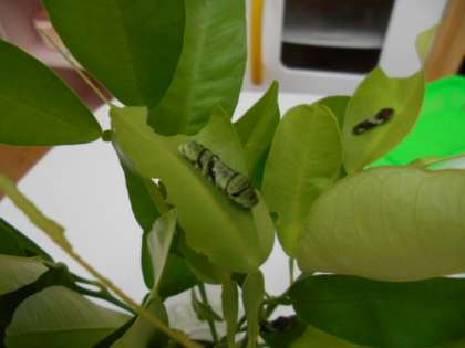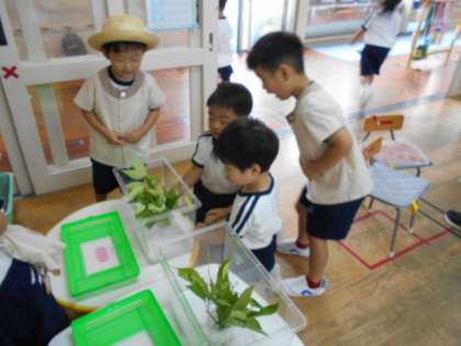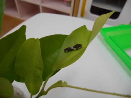 「家の木にたくさん黒い幼虫がいましたよ!」と、保護者の方が幼稚園に連れてきてくれたいもむし。ミカンの葉っぱをたくさん食べて大きくなってきました。この日は、少し緑色に変身している「いもむし君」を子どもたちが発見していました。