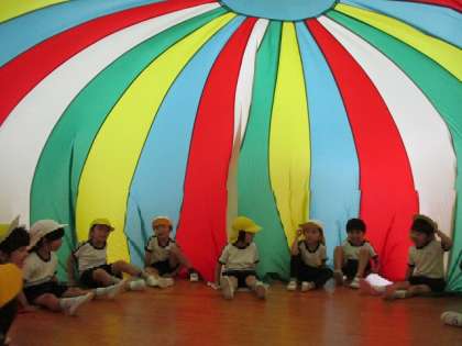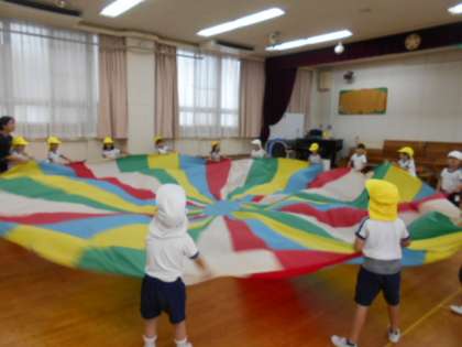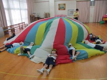 きく組(5歳児)がパラバルーンで遊びました。大きく広げたパラバルーンを波打たせたり、膨らまして中に入ったり、外側に座ってみたりと、みんなでタイミングを合わせてパラバルーンを動かす楽しさを感じはじめています。