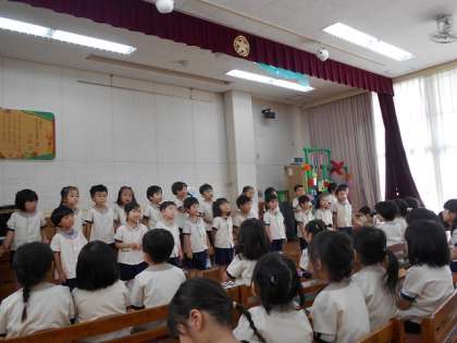 今日は1学期終業式でした。園長先生に1学期に頑張ったこと成長したことを、たくさん褒めていただきましたね。元気いっぱい楽しく遊んで心も体も大きくなりました!お家の方にも歌を聞いていただいて嬉しかったですね。楽しい夏休みを過ごしてくださいね。