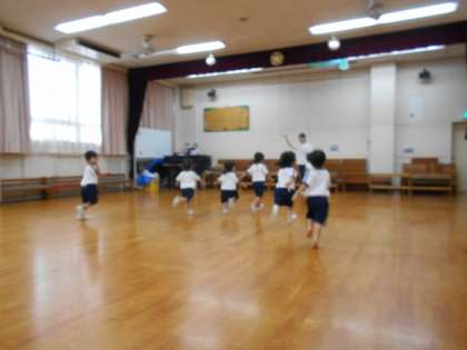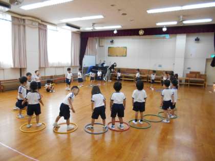 子どもたちが、遊戯室で遊んでいました。きく組(5歳児)はいろいろな縄遊びに挑戦したり、ばら組(4歳児)はフープで遊んだり、さくら組(3歳児)はかけっこよーいドンをしたりして元気いっぱい楽しんでいました。