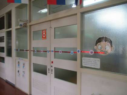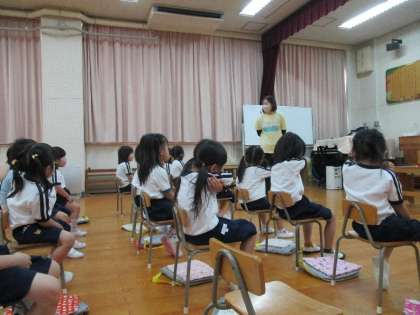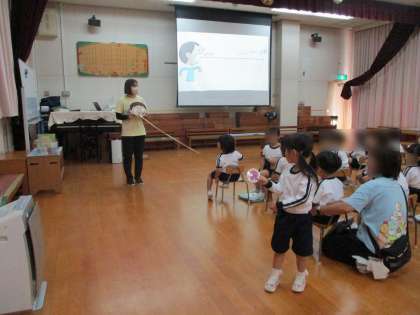 10月は「咳エチケット」についての保健指導を行いました。咳やくしゃみをするときは、周りの人に移さないための気配りが必要です。「咳エチケットって聞いたことあるかな?」と聞くと、ほとんどの子どもたちが初めて聞く言葉だったようです。咳やくしゃみのしぶきの中にはバイキン(菌やウイルス)がたくさんいることや、しぶきは遠くまで(2〜3m)飛ぶことを知らせました。実際の長さをテープを使って知らせると、「そんなに遠くまで!!(飛ぶんだ)」「みんなにうつっちゃう」など様々な声が聞かれました。最後にみんなで咳エチケットのやり方を確認しました。これから感染症が流行する季節となります。咳エチケットが身につくようにご家庭でもご協力をお願いします。