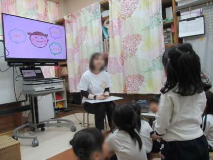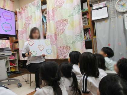 さくら組(年少児)に「ふわふわ言葉とちくちく言葉」についての保健指導を行いました。ふわふわ言葉は誰かに言われると嬉しくなる言葉でちくちく言葉は誰かに言われると悲しくなる言葉のことです。幼稚園がふわふわ言葉でいっぱいになるようにこれまで友達やお家の人に言われて嬉しかった言葉を伝え合いました。「ありがとう」「一緒に遊ぼう」などたくさんの嬉しい言葉が集まりました。