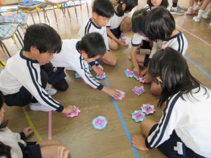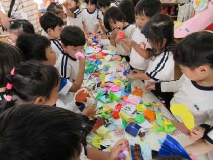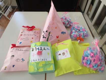 交流の最後に2年生からプレゼントをいただきました。わくわくしながらみんなでプレゼントの袋をあけると、たくさんのおもちゃが出てきました!折り紙のこまや、画用紙など身近な素材でつくったお寿司やオムライスなどに子どもたちは大喜びでした。
