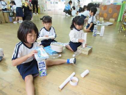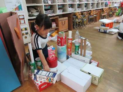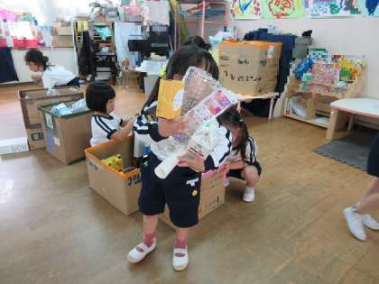 さくら組(3歳児)が、いろいろな箱や筒などの素材を並べたり積んだりしながら遊んでました。「これはお城だよ」「滑り台だよ」と見立てながら、どんどんイメージを膨らませて楽しんでいました。