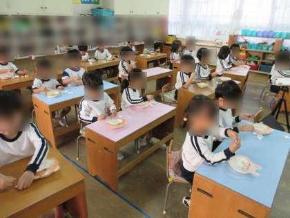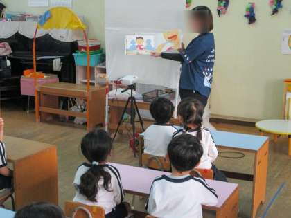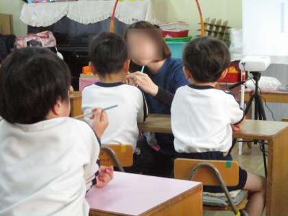年中児を対象に箸の正しい持ち方の保健指導を行いました。箸の持ち方を知らせた後、スチロール材を箸でつかむ練習をしました。最初は箸を思うように動かせませんが、何度も何度も挑戦していました。つかむことができると、「見て!できたよ!」「もう一回やってみる!」などとても嬉しそうにしていました。