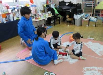 東中学校のお兄さんお姉さんが、職場体験学習で幼稚園にやってきました。園児は優しいお兄さんお姉さんにたくさん遊んでもらって大喜びでした。中学生は「子どもたちと一緒に遊ぶのは楽しかったけど、先生はいろいろなことを考えて遊んでいるんだなと思いました。自分が幼稚園の頃にお世話になった先生や家族へ感謝の気持ちがわきました」と話してくれました。園児にとっても中学生にとっても心の育ちにつながる貴重な機会になりました。