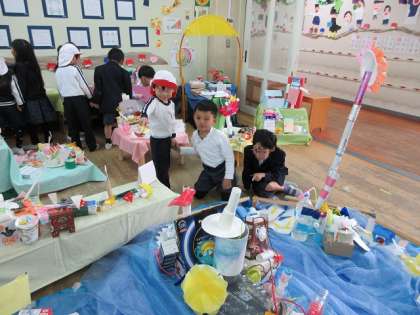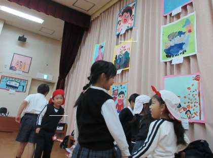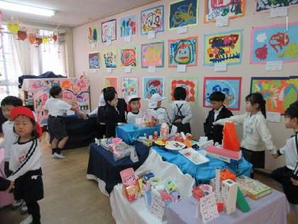 中大江小学校の1年生を幼稚園の作品展に招待しました。先日開催した幼稚園の作品展で、お家の人に作品や絵をみてもらった嬉しさから、園児は1年生にも自分や友達の作品を自信をもって紹介する姿がありました。1年生も「わー!すごいね!」「どれを作ったの?」と作品展を楽しんでいる様子でした。手を繋いで、一緒に作品を鑑賞する姿がほほえましかったです!