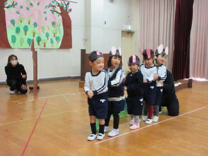 お話のいろいろな場面でごっこ遊びを楽しんできたことで「この役が好き!」「劇遊びに必要な道具をつくりたい!」など、主体的に表現する姿につながりました。また、友達や先生と一緒に力を合わせる楽しさや達成感は、子どもたちの自信につながりました。さくら組(3歳児)『とんとんとめてくださいな』・ばら組(4歳児)『おおかみと7ひきのこやぎ』・きく組(5歳児)『みつばちマーヤの冒険』のお話は、子どもたちにとっても先生たちにとっても特別なお話になりました。