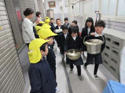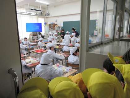 中大江小学校の1年生の給食を見学にいきました。「いいにおいだね」「おいしそう!」と興味津々の子どもたちでした。1年生が「おいしいよ!」と教えてくれたり、1年生の先生が献立の説明をしてくれたりしました。給食当番が調理員さんに大きな声で「ごちそうさまでした!」とあいさつをする姿も見せてもらいました。また、給食調理員さんが給食室から子どもたちに手を振ってくれたのもとても嬉しそうでした。様々な交流を通して、小学校への安心につながってほしいと願っています。