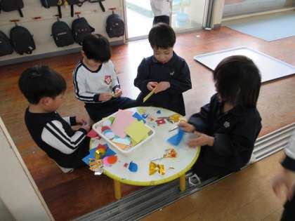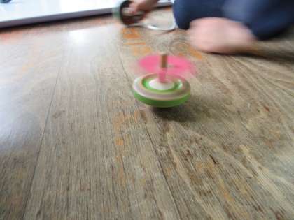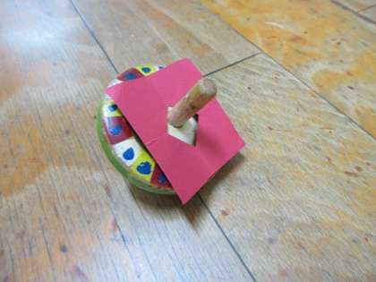 子どもたちが大好きなこま遊び、画用紙や折り紙の真ん中に穴を開けてこまにのせて回すと。。。。こまが変身します!子どもたちは自分なりに試行錯誤しながら、好きな遊びを楽しんでいます。