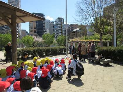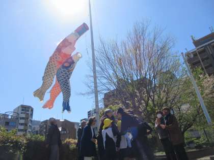 今日は、きく組(5歳児)ばら組(4歳児)が中大江公園で、中大江公園愛護会の方と一緒にこいのぼりをあげました。元気に泳ぐこいのぼりのように、みんなも元気に大きく育ちますようと、地域の方はいつも見守ってくださっていますよ。