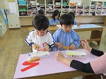 ばら組では、はさみで一回切りした折り紙を鱗にしてこいのぼりをつくりました。「♪やねより〜たかい〜こいのぼり」と歌を口ずさみながら、楽しそうにつくっている子どもたち。ハサミの使い方や持ち方、約束事もしっかりと守って取り組むことができました。完成した色とりどりのこいのぼりを眺める子どもたちの姿は、とても嬉しそうで微笑ましかったです。