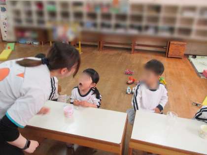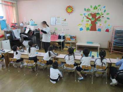 さくら組(3歳児)の弁当開始に合わせて歯みがき指導を行いました。どうして歯をみがくのか、歯ブラシの安全な使い方や約束を知らせました。初めての保健指導でしたが、教師の話をよく聞き、大きな歯の模型を見ながら一生懸命歯をみがく姿が見られました。朝から歯みがきの話を聞くことを楽しみにしてくれていたお友達もいて、「お話し楽しかったよ」「歯がピカピカになったよ」と嬉しそうに教えてくれました。これからも食べたら歯みがきで歯みがき名人になりましょうね!