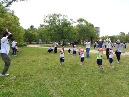 さくら組(3歳児)は、先生のまねっこをしていろいろな動物になってとんだりはねたりと、体をたくさん動かして遊びました。