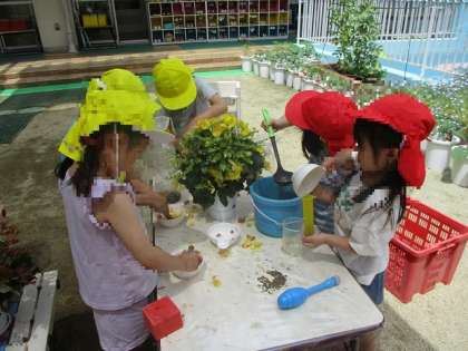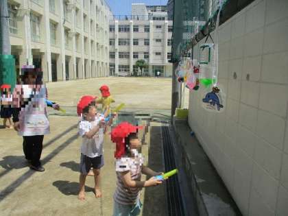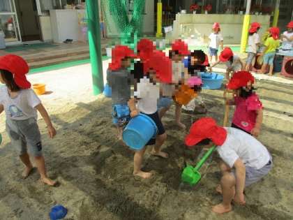 日に日に暑さも増し、園庭では水遊びが始まりました!泥遊びや水鉄砲、色水遊びなど、水の心地よさに触れながら友達と一緒に遊んでいます。