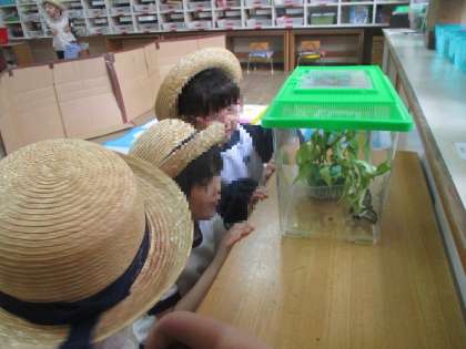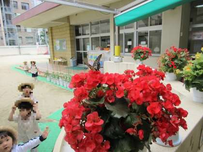 チョウのことを話していると、「このままだと可哀想だよ。」「お外に逃がしてあげよう。」という声があり、みんなで話し合って、チョウを外に離してあげることにしました。虫の飼育を通して、命の大切さや思いやりの気持ちを育んでいる子どもたちでした。