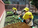 きく組(5歳児)は、5月に地域の方と一緒に植えたマリーゴールドとジニアの花を少し大きな苗ポットに植え替えました。方法を教えてもらい、友達と一緒に一生懸命植え替えていました。次の日には水やりをしました。花が咲くのがとても楽しみですね。