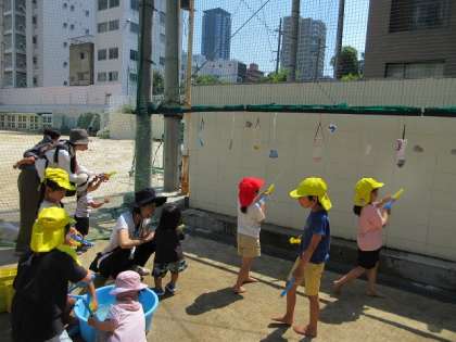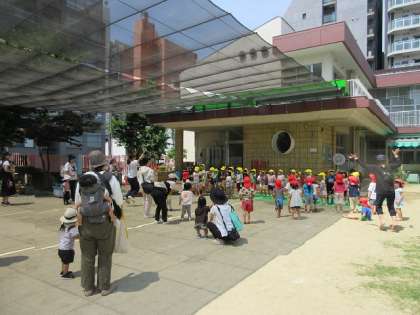 前回のなかよしデーにも、たくさんの未就園児のお友達が遊びにきてくれました。みんなで水遊びや、泥んこ遊びを楽しみました。最後は♪かみなりビリビリの体操を楽しみました。きく組(5歳児)が先生役になってくれました!