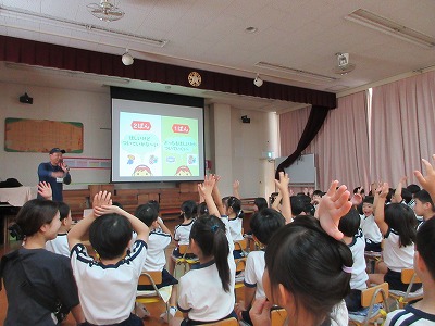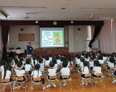 今日は、地域のパトロールをしてくださっている中央区「ゆめまるパトロール隊」の方に、夏休みに向けて防犯指導をしていただきました。「いかのおすし」の約束や110番についてなど、クイズを交えて楽しくお話をしていただきました。また、実際に不審者に話しかけられたときに大きな声で助けを求められるように、声出し体験もしました。夏休み、元気いっぱい安全に過ごせるように、約束を守って遊びましょうね。