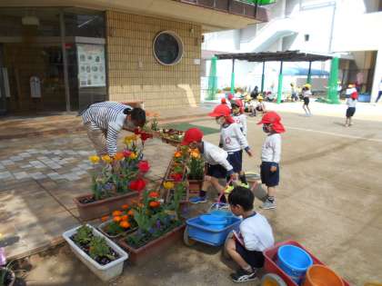 あっ!ダンゴムシがいるよ! ばら組さんが先生と一緒に、プランターの下にダンゴムシを発見!