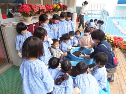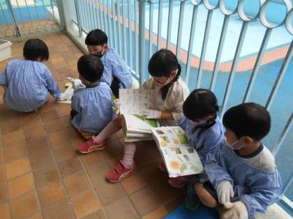 ヒマワリのお花のことを図鑑で調べ、「一週間で芽が出るみたい!」と調べたことを、嬉しそうにお友達と知らせあっていました。